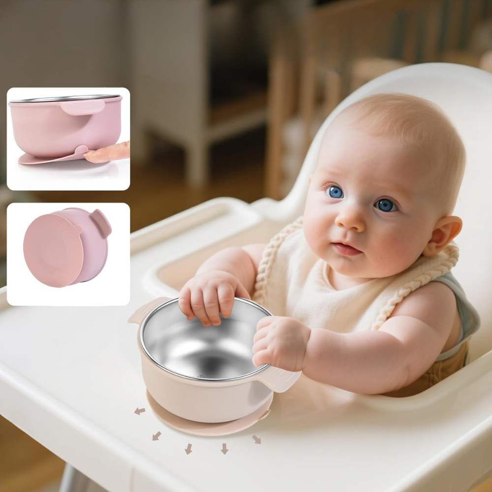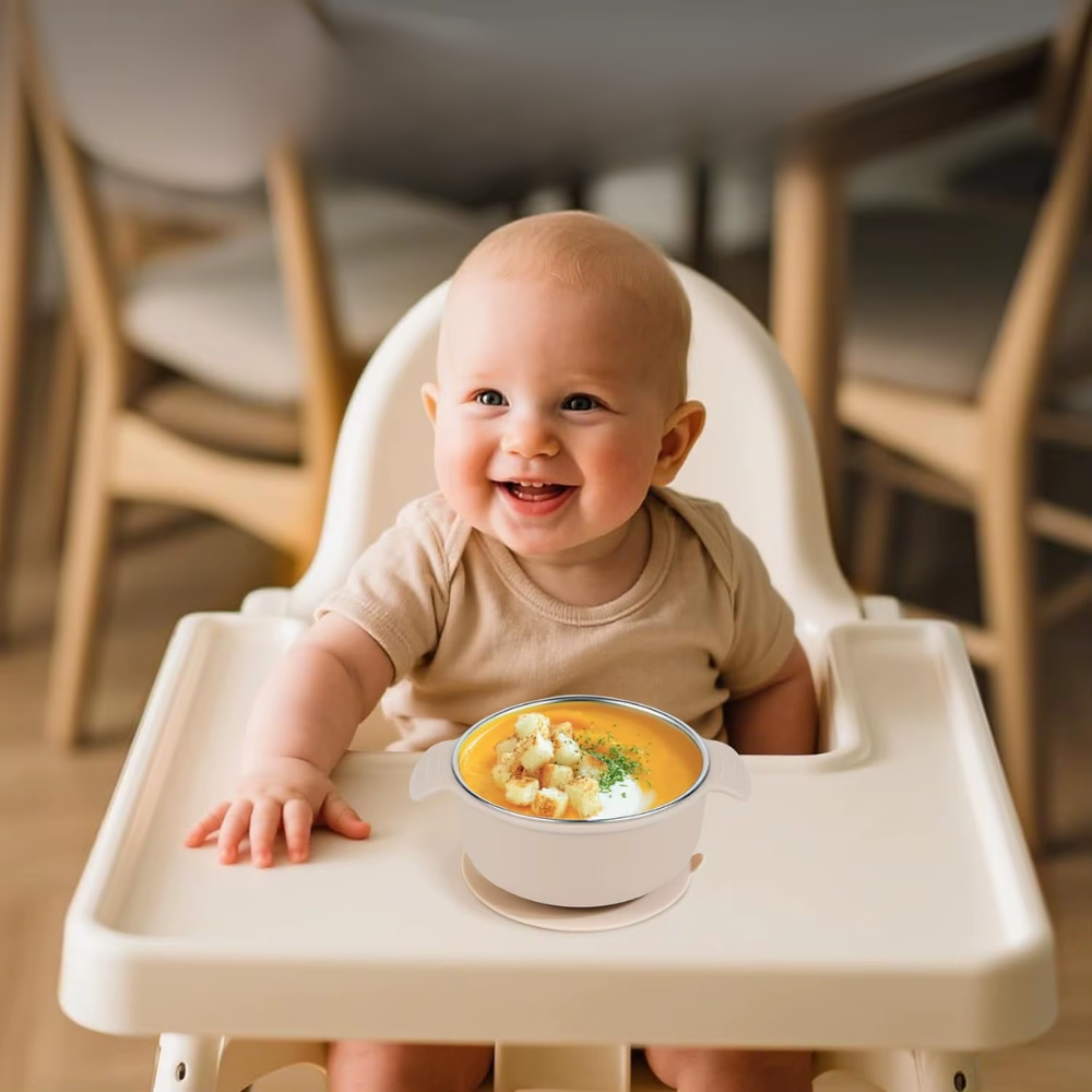 Bowls de acero inoxidable 304 con base de silicona extraíble y antideslizante. Resistentes, seguros, fáciles de limpiar y diseñados para mantener el sabor puro de los alimentos. Una opción práctica e higiénica para las comidas de los más pequeños.