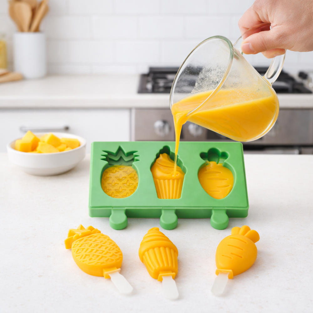 Prepara heladitos naturales y saludables en casa con nuestros moldes de silicona. Fáciles de usar, seguros para peques y con divertidas formas que hacen cada momento aún más especial. *Incluye tapa y palitos.