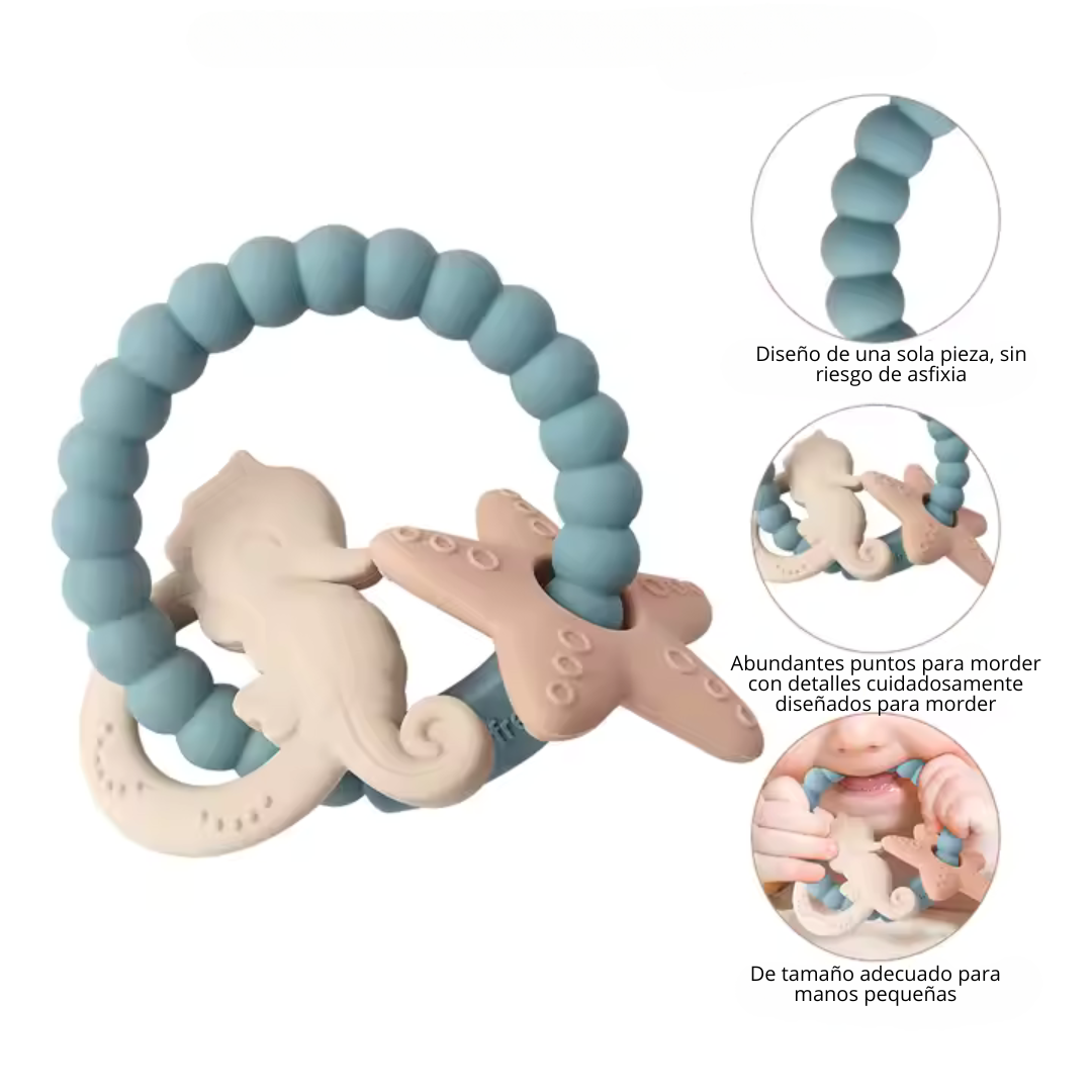 Este encantador juguete, inspirado en una estrella de mar y un caballito de mar, está diseñado pensando en los más pequeños. Su tamaño es ideal para manos pequeñas, lo que facilita su agarre y manejo. Además, cuenta con texturas táctiles que estimulan los sentidos y fomentan el desarrollo gráfico visual. Fabricado en una sola pieza, es completamente liso, sin bordes ásperos ni uniones, lo que garantiza seguridad y comodidad. Su diseño facilita la limpieza, convirtiéndolo en una opción práctica y segura para los bebés.