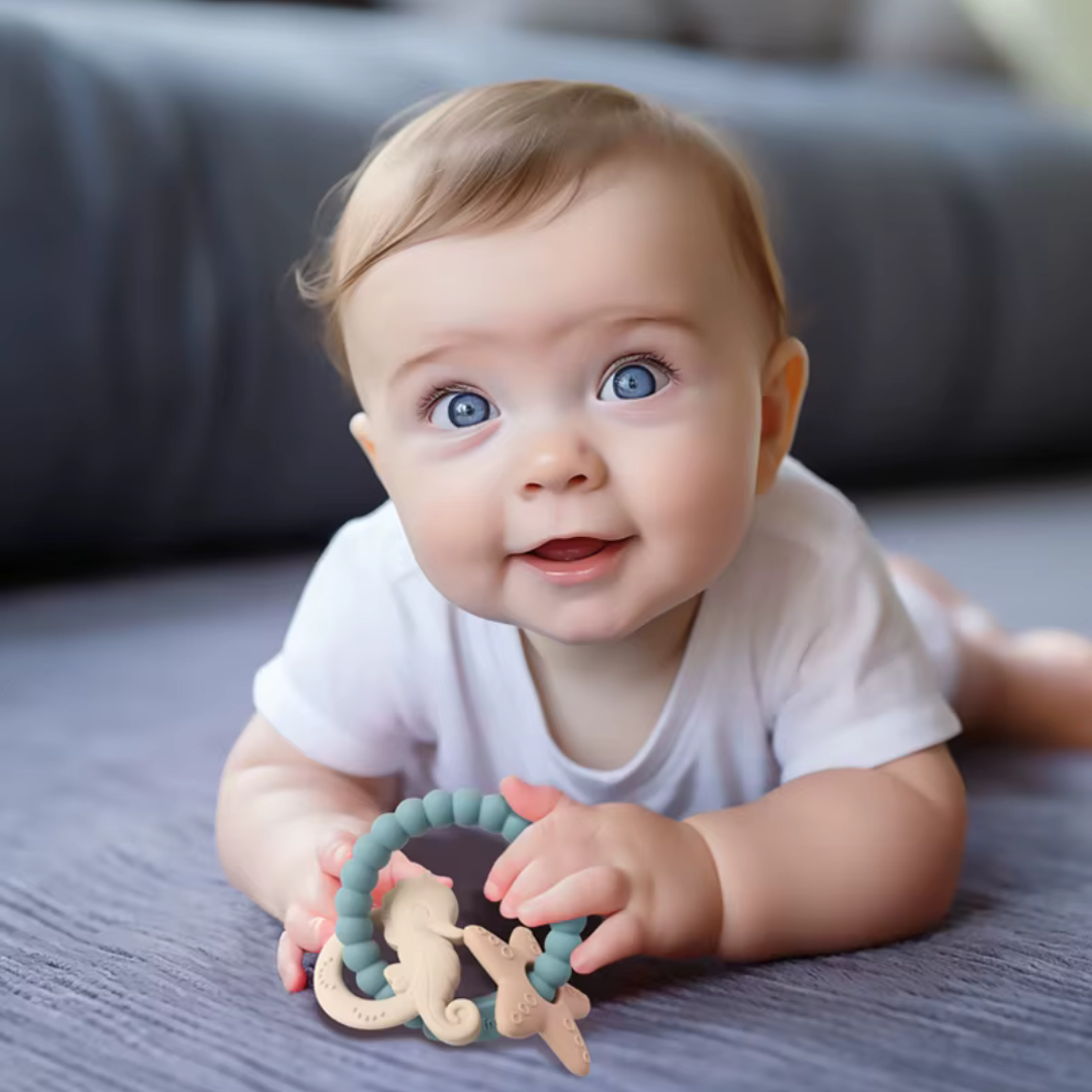 Aro multisensorial 100% silicona de grado alimenticio, libre de BPA y ftalatos. Con un diseño adorable que presenta una estrella de mar y un caballito de mar, este juguete está lleno de características táctiles para estimular los sentidos de tu bebé. Su diseño de una sola pieza es completamente limpio, sin extremos ni uniones, y su superficie lisa y sin bordes ásperos garantiza su seguridad y comodidad.