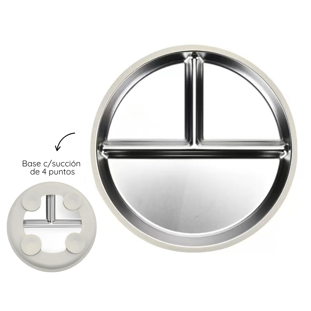 Platos de acero inoxidable 304 con base de silicona extraíble y antideslizante. Resistentes, seguros, fáciles de limpiar y diseñados para mantener el sabor puro de los alimentos. Una opción práctica e higiénica para las comidas de los más pequeños.